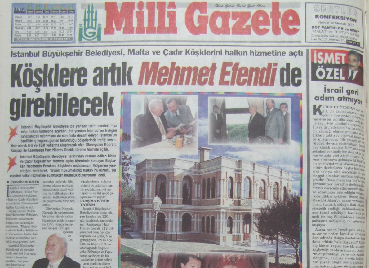 Merkezi idarenin, RP’nin kurucusu olduğu bir koalisyona geçmesiyle birlikte Erdoğan da nihayet köşkler konusundaki emellerine ulaşır. Önce sıkı bir tadilat yapılır. Çatı altları, elektrik aksamı, kapı-pencere doğramaları, bazı duvarların sıvaları yenilenir. Ardından halkın kullanımına, dönemin başbakanı ve RP genel başkanı Necmettin Erbakan’ın da katıldığı bir törenle açılır köşkler. 30 Eylül 1996 tarihli Milli Gazete tam sayfa ayırır bu gelişmeye: “Bizim hükümetimiz halkın hükümeti. Bu eserleri halkın hizmetine sunmaktan mutluluk duyuyorum” der açılışta Erbakan. Haberin başlığı “Köşklere artık Mehmet Efendi de girebilecek” diye atılmıştır. Bu başlığın manasını kavramak için gidip birkaç yıl sonrasının İstanbul Bülteni’nde verilen bir ilana göz atmamız gerekir.