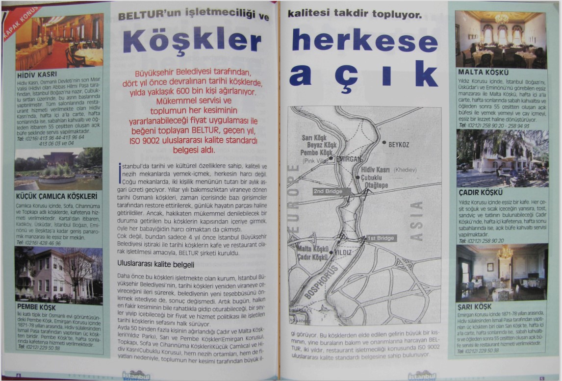 İlanın yayınlandığı İstanbul Bülteni’nin tarihini not düştüğüm yeri bulamadım ama bir şekilde fotoğrafını buldum gördüğünüz gibi. 1999 yılının Ağustos ayından diye hatırlıyorum. Önce spota bakalım: “Büyükşehir Belediyesi tarafından dört yıl önce devralınan tarihi köşklerde yılda yaklaşık 600 bin kişi ağırlanıyor. Mükemmel servisi ve toplumun her kesiminin yararlanabileceği fiyat uygulaması ile beğeni toplayan BELTUR, geçen yıl, ISO 9002 uluslararası kalite standardı belgesi aldı.”