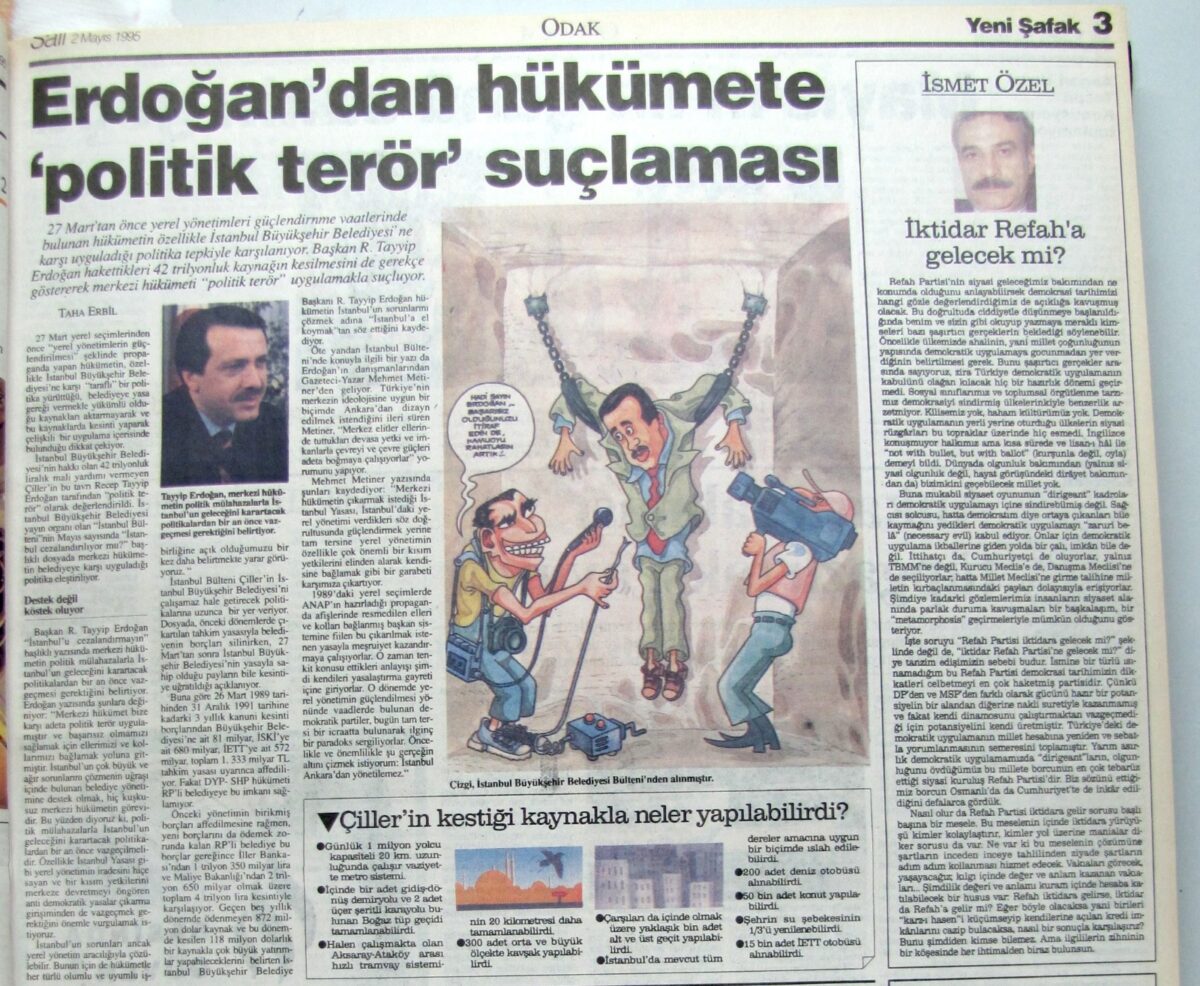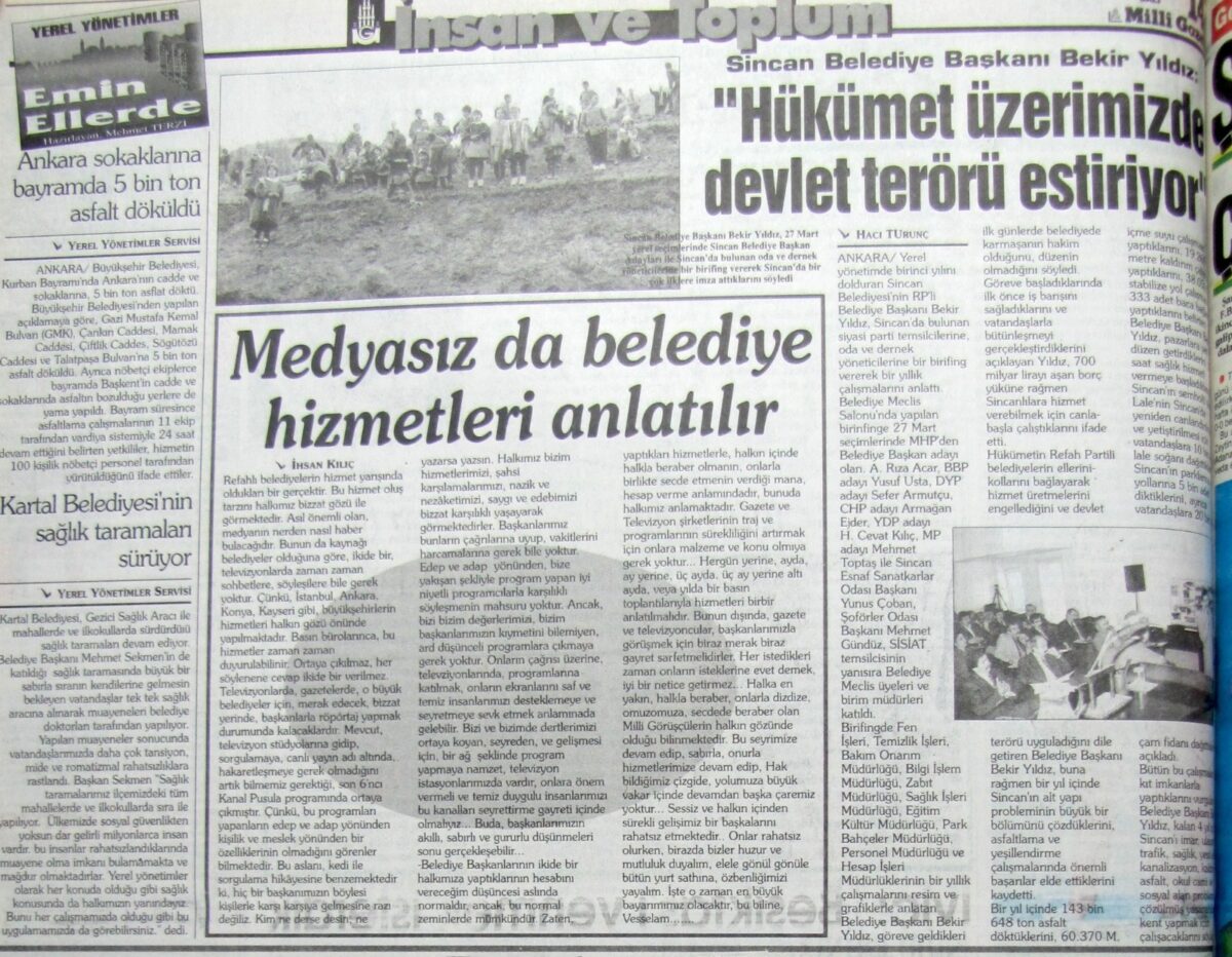 Konu bütünlüğünü sürdürebilmek için zaman içinde bir ileri bir geri zıplamak durumunda kalıyorum. Tam bu yerde, İBB başkanının imzalı yazıyla halka ve diğer siyasi aktörlere seslenme ihtiyacı duymasının sebebini de hatırlamamız iyi olur sanki. 15 Mayıs 1995 tarihli Milli Gazete’de İhsan Kılıç imzalı minik bir yazıya uğrayacağız. Sol üst köşesinde bu defa dönemin ünlü Sincan Belediye Başkanı Bekir Yıldız’ın “hükümet üzerimizde devlet terörü estiriyor” başlığıyla verilen serzenişi var. Erdoğan’ın yukarıda aktardığım sözlerini daha sert bir dille, belli ki ondan önce dile getirmiş Yıldız. İhsan Kılıç ise Refahlı belediye başkanlarının dönemin ana akım medyasından gelen davetlere olumlu cevap vermelerinden yakınıyor: “Mevcut televizyon stüdyolarına gidip sorgulanmaya, canlı yayın adı altında hakaretleşmeye gerek olmadığını artık bilmemiz gerektiği, son 6’ıncı Kanal Pusula programında ortaya çıkmıştır…. Onların çağrısı üzerine, televizyonlarında, programlarına katılmak, onların ekranlarını saf ve temiz insanlarımızı desteklemeye ve seyretmeye sevk etmek anlamına da gelebilir.” (Doğrusu güzel taktik.)