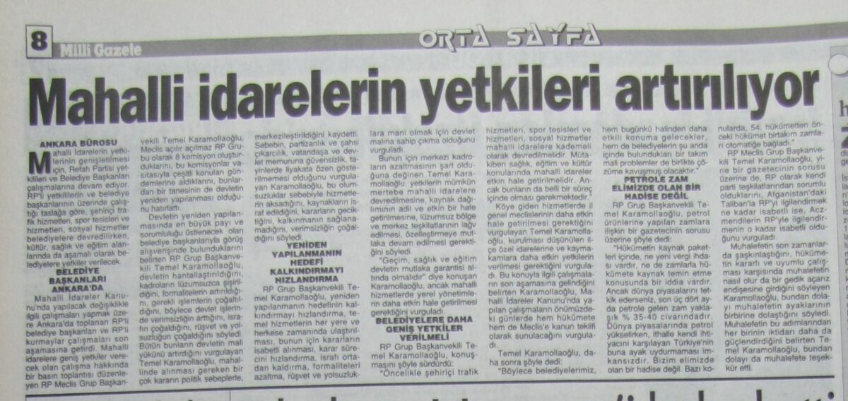 Derken, Anayol koalisyonu dağılır, 28 Haziran 1996’da Refahyol hükümeti kurulur. “İstanbul Yasası” tasarısının müellifi Tansu Çiller artık başbakan yardımcısıdır. Refahyol’un ilk işlerinden biri yerel yönetimlerin yetkilerini artıracak adımlar atmaktır. Erbakan ve ekibi, merkezi idaredeki ilk yıllarında Erdoğan ve ekibinin de yaptığı gibi, her an bir müdahaleyle karşılaşabileceklerini ve ancak yerel seçimlerde daima avantajlı olacaklarını düşündükleri için, hazır dizginler ellerindeyken yerel yönetimleri güçlendirme işini ele alırlar. Milli Gazete’nin 24 Ekim 1996 tarihli nüshasında “Mahalli idarelerin yetkileri artırılıyor” diye müjdelenmesinin sebebi budur. RP’li belediye başkanları Ankara’da toplanır ve Mahalli İdareler Kanunu’nda yapılacak değişiklikleri tartışırlar. RP’nin Meclis Grup Başkanvekili o dönemde Temel Karamollaoğlu’dur. Devletin yeniden yapılanmasında yerel yönetimlerin büyük önemi olduğunu kaydeder. Ona göre mahallinde alınması gereken birçok karar, partizanlık, şahsi çıkarcılık, vatandaşa ve devlet memuruna güvensizlik yüzünden merkezileştirilmiş ve her işi olması gerekenden daha maliyetli kılmıştır.