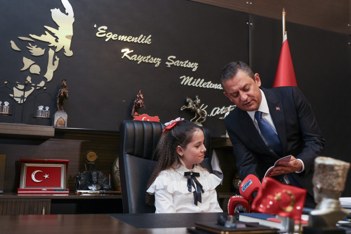 Cumhuriyet Halk Partisi Genel Başkanı Özgür Özel, 23 Nisan Ulusal Egemenlik ve Çocuk Bayramı’nda TBMM’deki odasında koltuğunu 10 yaşındaki Dora Mimaroğlu’na devretti.