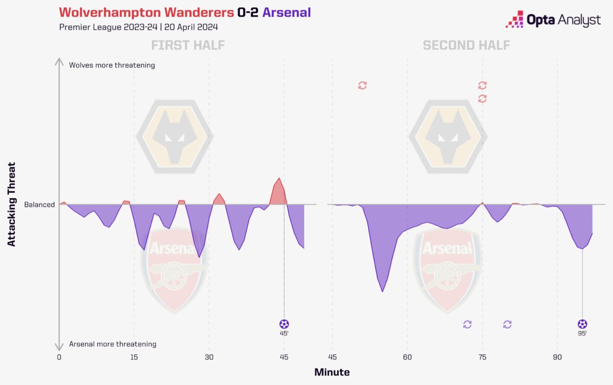 Hem genel istatistik, hem de atak grafiğinde gördüğümüz üzere neredeyse baştan sona oyunun hakimi Arsenal’di. Wolves’un direkten dönen bir şut dışında tehlike yarattığını söyleyemeyiz. Arsenal de goller dışında çok ciddi pozisyonlara girmekte zorlandı. Alışılmışın dışında bir Arsenal gördük aslında. Çünkü Bayern’e elenmek ciddi anlamda takım içerisinde bir hayal kırıklığı yaratmış ve bunu tam olarak üstlerinden atamamışlar.