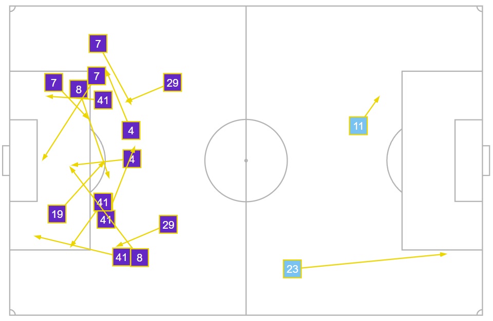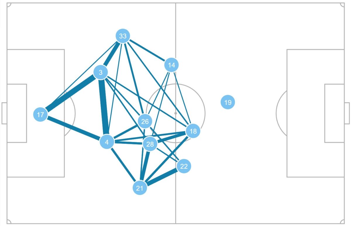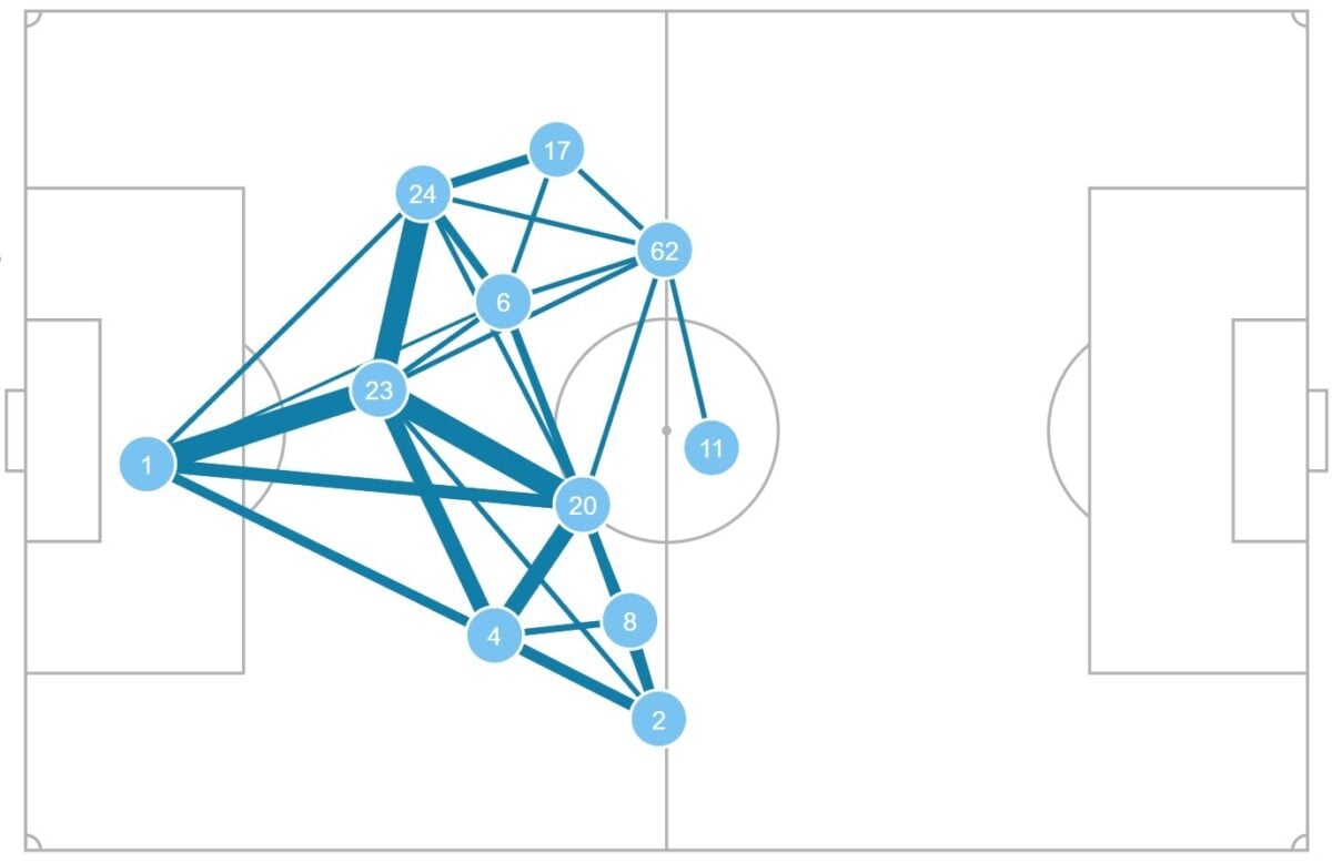 Kilit paslarda Rice ve Saka’nın çok etkin olduğunu görüyoruz. Wolves üçüncü bölgede kapandığı için kilit pasların pek çoğu bu bölgede gerçekleşti. İkinci görselde de Wolves’un pas haritasına bakıyoruz ve buradaki en ilginç şey ise sağ bek Doherty’nin sağ kanatta en ilerideki oyuncu olması. Haritaya göre diziliş sanki 3-5-2 gibi duruyor, hatta 3-4-3 bile diyebiliriz.