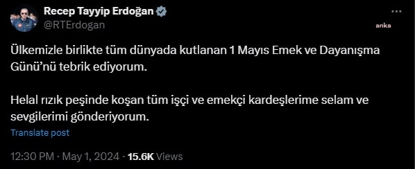12.39: Cumhurbaşkanı ve AKP Genel Başkanı Recep Tayyip Erdoğan, 1 Mayıs Emek ve Dayanışma Günü dolayısıyla yayınladığı mesajda, “Ülkemizle birlikte tüm dünyada kutlanan 1 Mayıs Emek ve Dayanışma Günü’nü tebrik ediyorum. Helal rızık peşinde koşan tüm işçi ve emekçi kardeşlerime selam ve sevgilerimi gönderiyorum” dedi.