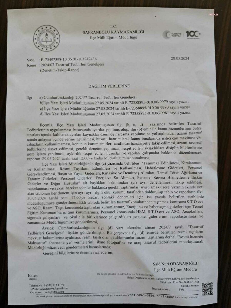 Safranbolu İlçe Milli Eğitim Müdürlüğü, okullara Kamuda Tasarruf Paketi kapsamında alınacak tedbirleri içeren bir yazı gönderdi. Müdürlükten gönderilen yazıda, kamu binalarında su ısıtıcısı ve çay makinesi gibi cihazların kullanılmaması, konunun kurum amirleri tarafından hassasiyetle takip edilmesi, azami tasarruf tedbirlerine riayet edilmesi ve gerekli denetimlerin yapılması istendi.