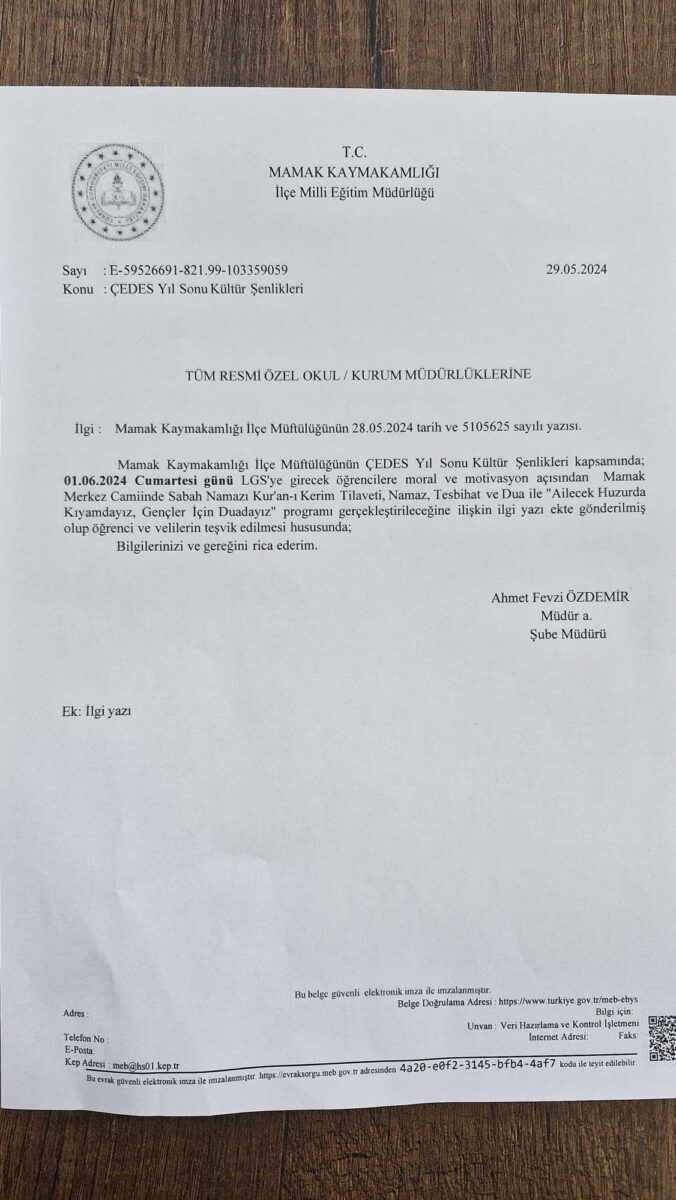 “Mamak Kaymakamlığı İlçe Müftülüğü’nün ÇEDES Yıl Sonu Kültür Şenlikleri kapsamında 01.06.2024 Cumartesi günü LGS’ye girecek öğrencilere moral ve motivasyon açısından Mamak Merkez Camii’nde sabah namazı Kur’an-ı Kerim tilaveti, namaz, tesbihat ve dua ile “Ailecek Huzurda Kıyamdayız, Gençler İçin Duadayız” programı gerçekleştirileceğine ilişkin ilgi yazı ekte gönderilmiş olup öğrenci ve velilerin teşvik edilmesi hususunda bilgilerinizi ve gereğini rica ederim.”
