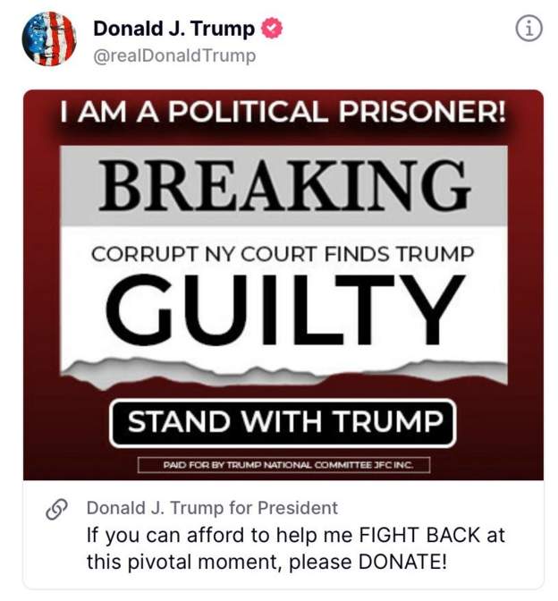 Hükûm giydikten birkaç dakika sonra Trump, kendi kurduğu sosyal medya ağı Truth Social’den bağış toplamaya başladı. Paylaştığı gönderide “Ben siyasî bir mahkumum” ifadesini kullanan Trump, “Az önce hileli bir cadı avı davasında mahkum edildim. Ben yanlış bir şey yapmadım” dedi.