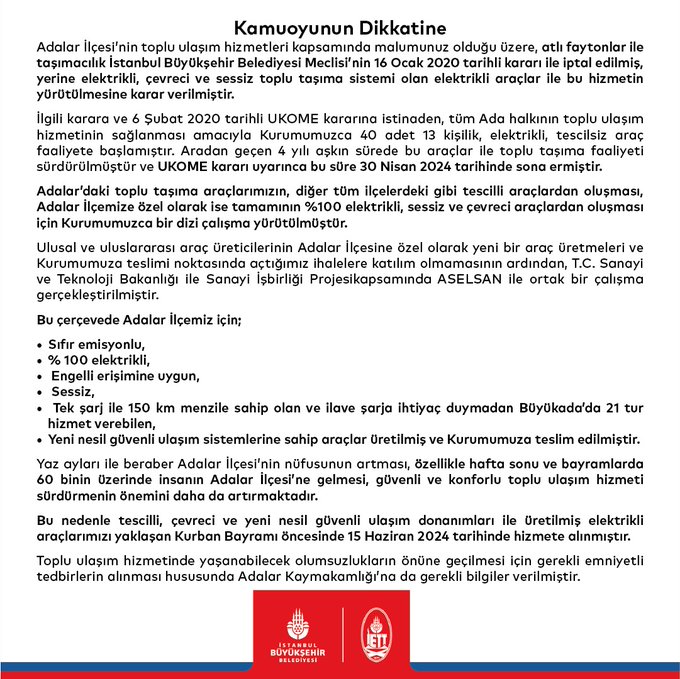 “Büyükada, Heybeliada, Burgazada ve Kınalıada’dan oluşan Adalar İlçesi’ndeki nüfusun büyük bir bölümü, faytonların kaldırılmasından ve toplu ulaşımın İBB ve İETT tarafından 2020 yılından bu yana tamamen net, programlı ve ekonomik olarak sağlanmasından memnun olduğunu ifade etmektedir.