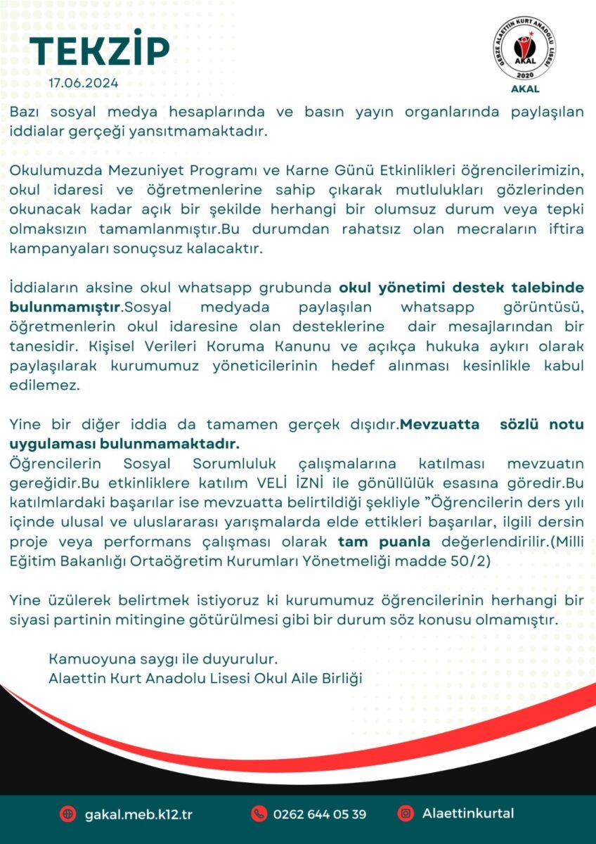 Kıyafetleri nedeniyle Kocaeli Alaettin Kurt Anadolu Lisesi’ndeki mezuniyet törenine alınmayan öğrencilerin iddiaları ardından lisenin Okul Aile Birliği tarafından açıklama yapıldı. Açıklamada, öğrencilerin sosyal sorumluluk çalışmalarına katılmasının mevzuatın gereği olduğu vurgulandı, sözlü notunun bulunmadığı ifade edildi. Yayımlanan tekzipte öğrencilerin siyasi parti mitingine götürülmediği de belirtildi.