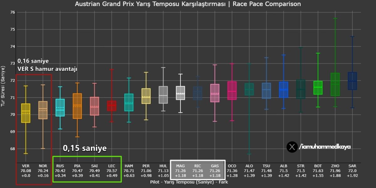 Matematiksel olarak baktığımızda da her iki pilot da zaman zaman en hızlı turları attı ancak yarış sonunda tempo farkları yalnızca 0,16 saniye dolaylarındaydı. Max Verstappen’in son turlarda attığı yumuşak hamurlu stintini düşündüğümüzde neredeyse aynı tempolara denk geliyor diyebiliriz. Şahane kapışma ama kötü son.