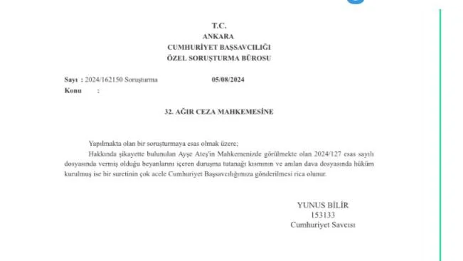 Eski Ülkü Ocakları Genel Başkanı Sinan Ateş’in öldürülmesine ilişkin dava sürerken, Ayşe Ateş mahkemede ismini verdiği MHP’li İzzet Ulvi Yönter ve Semih Yalçın’ın kendisi hakkında suç duyurusunda bulunduğunu paylaştı.