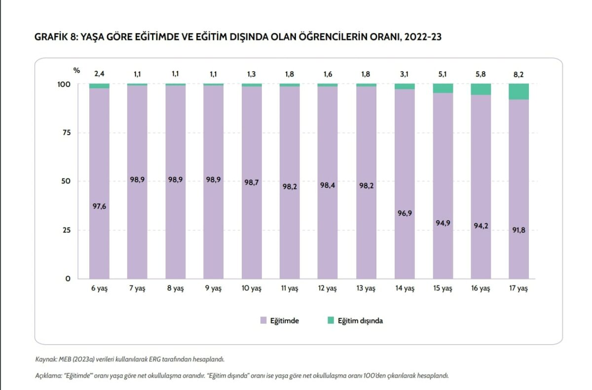 Bu veriler, zorunlu eğitim çağında olmalarına rağmen 13 yaşından sonra çocukların artan oranda eğitim dışına çıktığını gösteriyor. 14 yaşındaki çocukların yüzde 3,1’i okula kayıtlı değilken, bu oran 17 yaşında yüzde 8,2’ye yükseliyor.