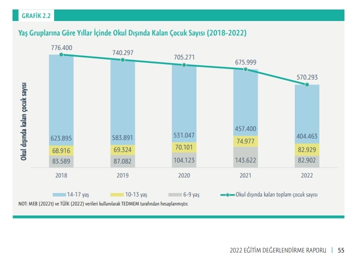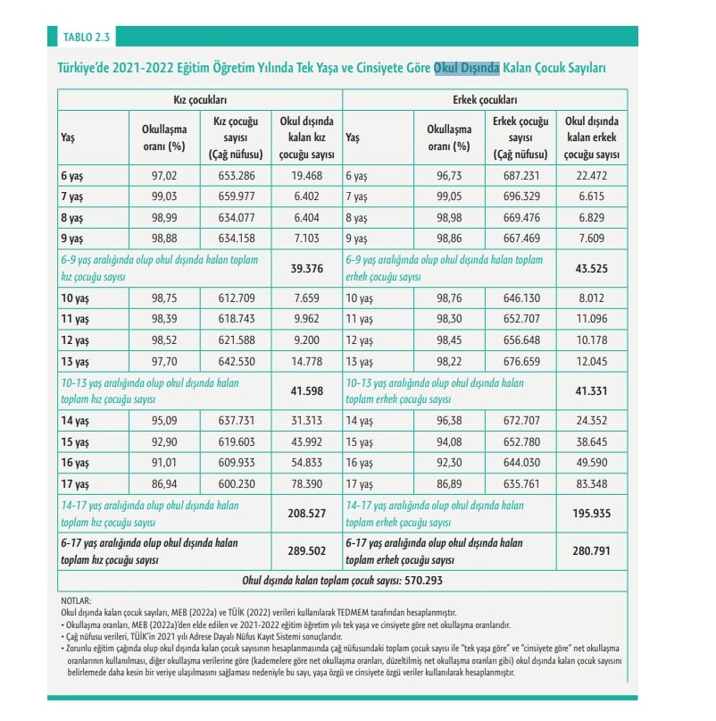 TEDMEM, Türk Eğitim Derneği’nin düşünce kuruluşu. TEDMEM’in eğitim değerlendirme raporu, eğitim dışında kalmış çocuklara yönelik önemli veriler sunuyor. Rapora göre, 2021-2022 eğitim öğretim yılına ait resmi verilerle karşılaştırıldığında, zorunlu eğitim çağındaki 570 bin 293 çocuk okula gitmiyor.