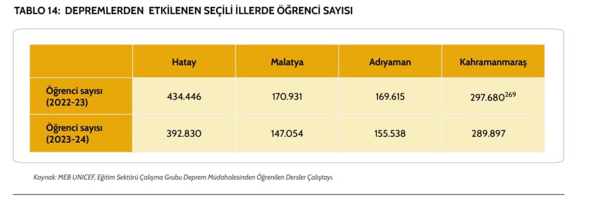 6 Şubat 2023 tarihli Kahramanmaraş merkezli depremler sonrası yapılan Türkiye Koruma Sektörü İhtiyaç Analizi anketi de çocukların eğitime erişiminde yaşanan sorunları ortaya koydu. Anketi yanıtlayan ailelerin yüzde 21,8’i, çocuklarının deprem sonrası okula gitmediğini belirtiyor. Tüm çocuklarının okula gittiğini söyleyen ailelerin oranı ise yüzde 61,9. Eğitim dışında kalan çocukların nedenleri arasında ekonomik sorunlar, okulların uzaklığı ve çocukların kötüleşen psikolojik durumları gösteriliyor.