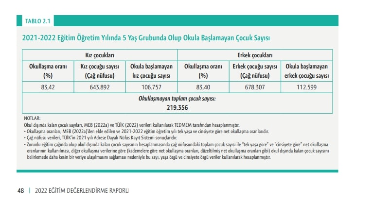 TEDMEM, 2021-2022 eğitim öğretim yılında 5 yaş grubundaki yaklaşık 219 bin çocuğun ne okul öncesi ne de ilkokul eğitimine dahil olmadığını belirtiyor.