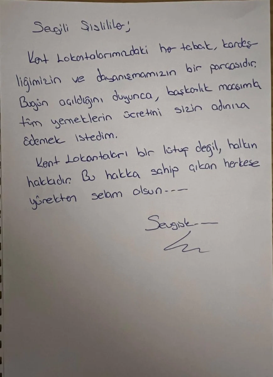 “Kent Lokantalarımızdaki her tabak, kardeşliğimizin ve dayanışmamızın bir parçasıdır. Bugün açıldığını duyunca, başkanlık maaşımla tüm yemeklerin ücretini sizin adınıza ödemek istedim. Kent Lokantaları bir lütuf değil, halkın hakkıdır. Bu hakka sahip çıkan herkese yürekten selam olsun.”
