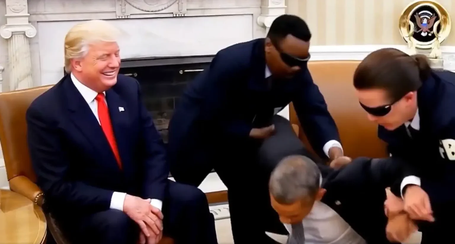 Yapay zekâ destekli video, FBI ajanlarının toplantıya baskın düzenleyerek Obama’yı diz çöktürdüklerini ve kelepçe taktıklarını, Trump’ın ise gülümseyerek izlediğini gösteriyor. Bu sırada Village People’ın “Y.M.C.A.” şarkısı çalıyor.