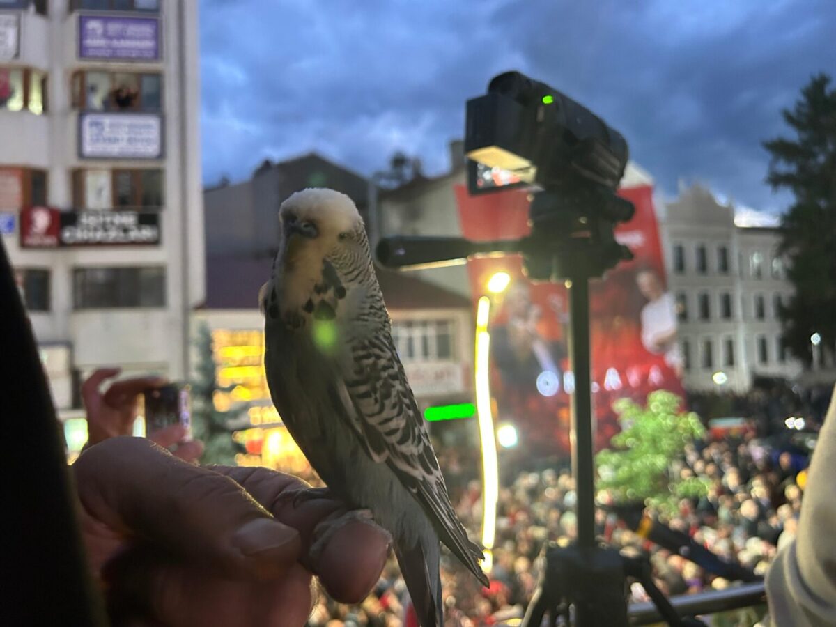 Özel konuştuğu sırada bir muhabbet kuşu basın otobüsüne kondu. Basın mensupları zarar görmemesi için kuşu alarak nereden gelmiş olabileceğini sordu. Muhabbet kuşu, Özel ve İmamoğlu’nun pankartıyla aynı kadrajda Bolu mitingine konuk oldu.