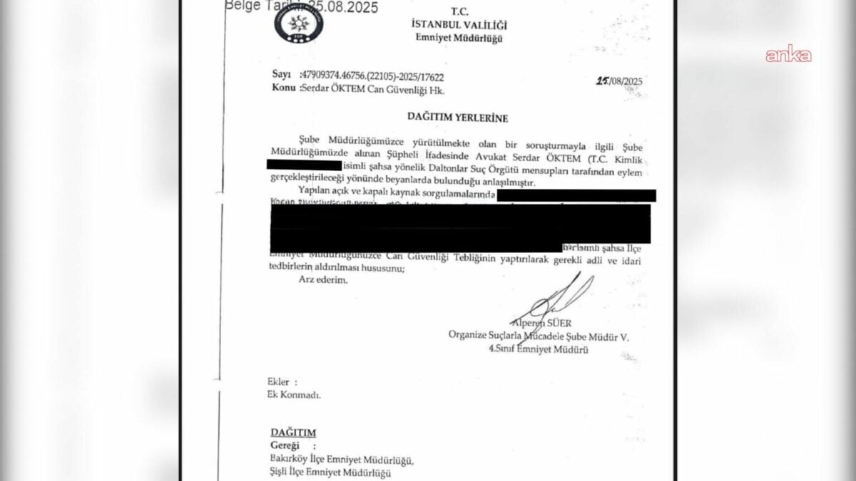 İstanbul Emniyet Müdürlüğü’nün 25 Ağustos’ta Bakırköy İlçe Emniyet Müdürlüğü ve Şişli İlçe Emniyet Müdürlüğü’ne Öktem’in can güvenliğine ilişkin gönderdiği yazı ortaya çıktı. Belgede, şu ifadeler yer aldı: