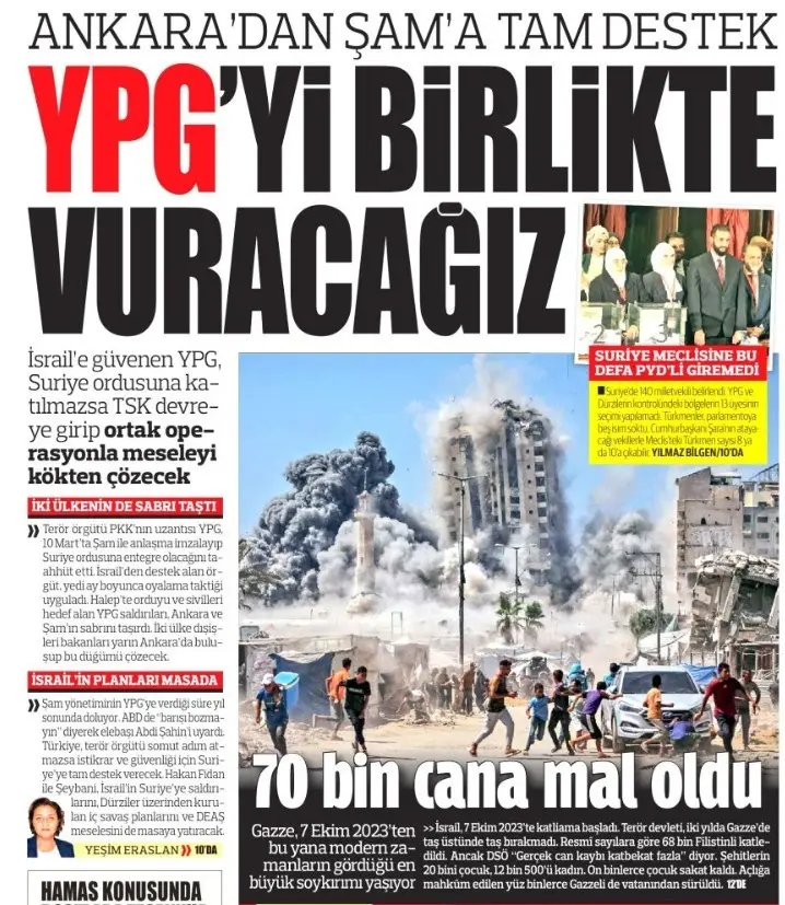 7 Ekim Salı günü Türkiye Gazetesi “Ankara’dan Şam’a tam destek: YPG’yi birlikte vuracağız“ manşetiyle çıktı. Haberin spotu da şöyleydi: İsrail’e güvenen YPG, Suriye ordusuna katılmazsa TSK devreye girip ortak operasyonla meseleyi kökten çözecek.“