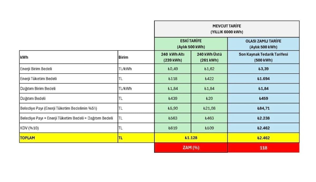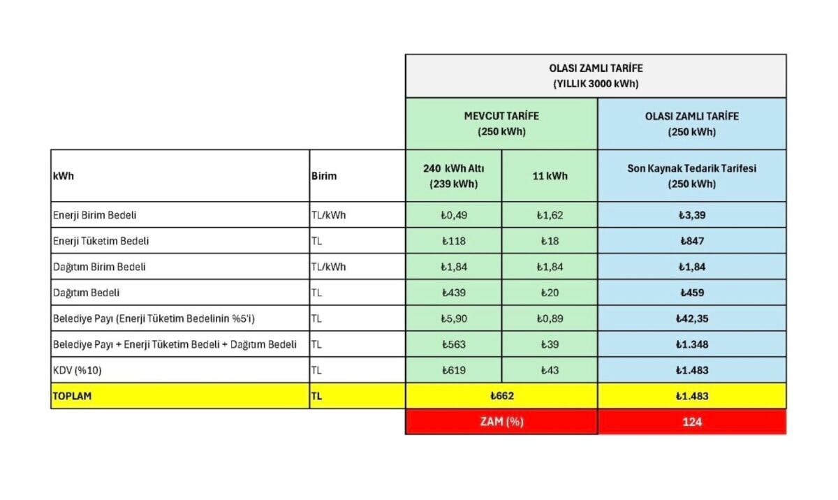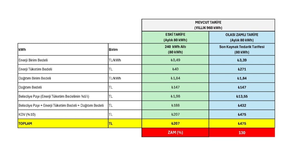 Yavuzyılmaz, sosyal medya hesabından yaptığı açıklamada, zamların “gizli biçimde yapılacağına” işaret etti, “45 milyon vatandaşa gizli elektrik zammı! Apartmanların ortak kullanımındaki elektrik faturalarına —asansör, hidrofor, otomat, çevre aydınlatma gibi kalemler dahil olmak üzere— yüzde 130’a varan oranlarda zam geliyor” dedi.