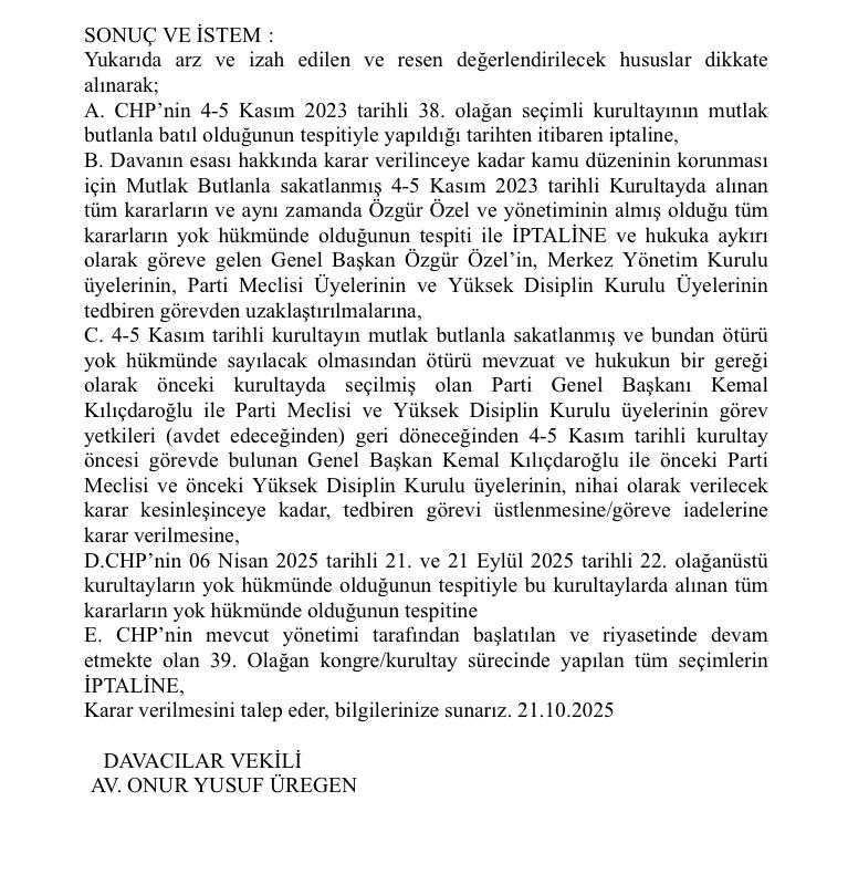 CHP’nin 6 Nisan’daki 21. ve 21 Eylül’deki 22. Olağanüstü kurultaylarının yok hükmünde olduğunun tespitiyle bu kurultaylarda alınan tüm kararların yok hükmünde olduğunun tespitine karar verilmesi istenen dilekçede, CHP’nin mevcut yönetimi tarafından başlatılan ve riyasetinde devam eden 39. Olağan Kurultay sürecinde yapılan tüm seçimlerin iptaline karar verilmesi istendi.