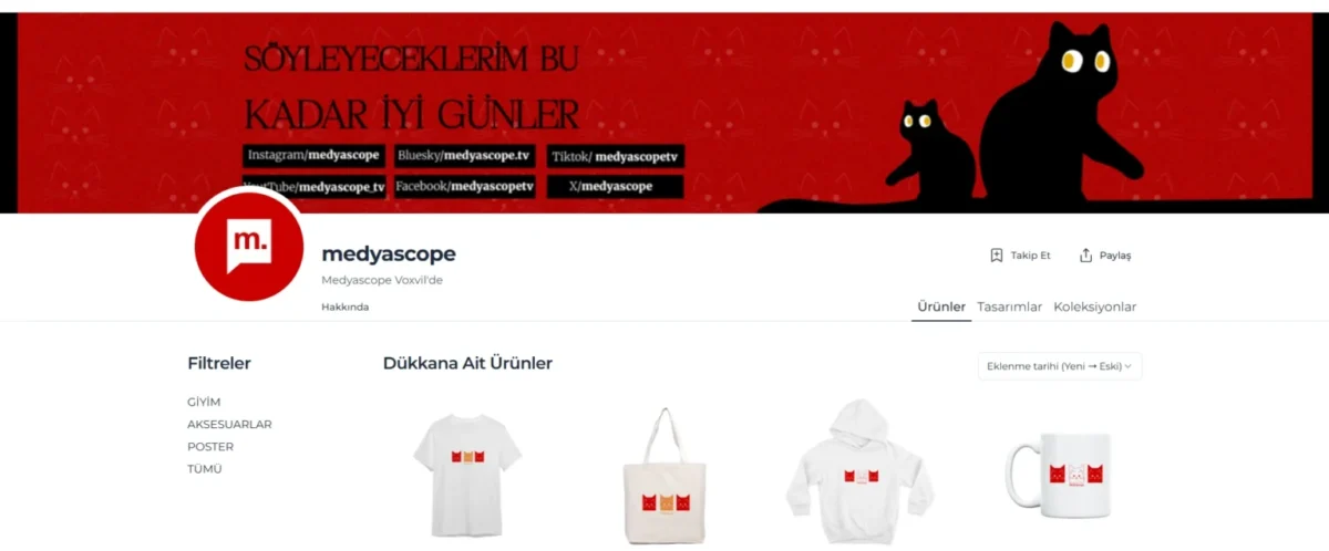 Medyascope gelirlerini çeşitlendirmeye devam ediyor. Dijital mağazamızı açtık. Tişört, çanta ve kupaların da aralarında olduğu özel tasarım ürünler artık Voxvil’de. Medyascope ürünlerini satın alarak hem tarzınızı yansıtabilir hem de bağımsız, nitelikli gazeteciliğe destek olabilirsiniz.