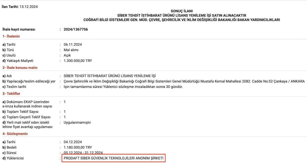 Özgür’ün Halk TV’deki haberine göre İlk ihale Çevre, Şehircilik ve İklim Değişikliği Bakanlığı’na bağlı Coğrafi Bilgi Sistemleri Genel Müdürlüğü’nün 6 Kasım 2024’te düzenlediği, ‘lisans yönetimi yazılım paketi’ alımı. 1 milyon 180 bin lira bedelle 4 Aralık 2024 günü sözleşme imzalandı. İkinci iş ise Sanayi ve Teknoloji Bakanlığı’nın düzenlediği ‘U.S.T.A. Siber İstihbarat Platformu Üyelik Bedeli’ ihalesi. İhale doğrudan temin ile yapıldı.795 bin lira bedelli ihalenin sözleşmesi 18 Haziran 2025 günü imzalandı.
