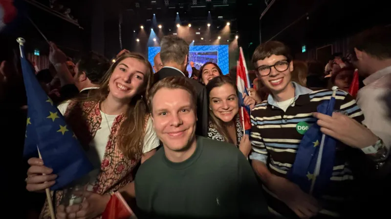 Leiden kentinde seçim sonuçlarını izleyen D66 destekçileri “Het kan wel” sloganını yeniden sahiplenirken, Jetten sahneye çıktığında “D66’nın şimdiye kadarki en iyi sonucunu elde ettik” dedi.