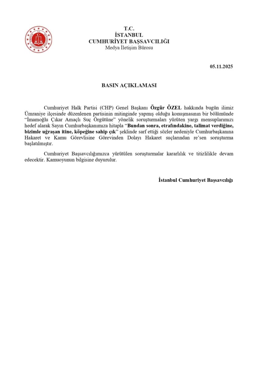 “Cumhuriyet Halk Partisi (CHP) Genel Başkanı Özgür Özel hakkında, bugün ilimiz Ümraniye ilçesinde düzenlenen partisinin mitinginde yaptığı konuşmanın bir bölümünde, ‘İmamoğlu Amaçlı Suç Örgütü’ soruşturmalarını yürüten yargı mensuplarını hedef alarak, Sayın Cumhurbaşkanımıza hitapla ‘Bundan sonra etrafındakine, talimat verdiklerine, bizimle uğraşan itine, köpeğine sahip çık’ şeklinde sarf ettiği sözler nedeniyle, Cumhurbaşkanına hakaret ve kamu görevlisine görevinden dolayı hakaret suçlarından re’sen soruşturma başlatılmıştır. Cumhuriyet Başsavcılığımızca yürütülen soruşturmalar kararlılık ve titizlikle devam etmektedir.”