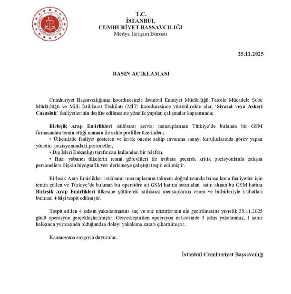 “Cumhuriyet Başsavcılığımız koordinesinde İstanbul Emniyet Müdürlüğü Terörle Mücadele Şube Müdürlüğü ve Milli İstihbarat Teşkilatı (MİT) koordinesinde yürütülmekte olan ‘Casusluk’ faaliyetlerinin deşifre edilmesine yönelik yapılan çalışmalar kapsamında;