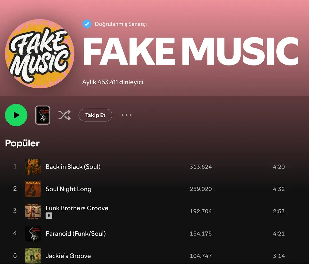 Geçen günlerde Spotify’da yeni bir çalma listesi dinlerken karşıma ilginç bir şey çıktı: Doğrulanmış sanatçı olarak Fake Music. “Nasıl yani?” dedim ve bu sahte müziğin aslında ne olduğunu araştırdım. Aslında bir süredir Spotify’da hayalet sanatçılar ya da gerçek sanatçı olmayan kişilerin eserlerinin yer aldığını biliyordum ancak bu şekilde bir şey görmemiştim. Yapay zekâ destekli üretilen bu müzik parçaları bir şekilde doğrulanıyor ve Spotify’ın bana da önerdiği gibi “Haftalık Keşif” çalma listesinde önerilebiliyor. Yeni sanatçılar ve şarkılar keşfetmek için bu çalma listesini dinlerim ve güncellenen parçalarla onlarca yeni şarkı keşfetmişimdir. Ancak bu yapay zekâ müziklerini burada bariz bir şekilde önerilerde gördüğüm için biraz şaşırdım.