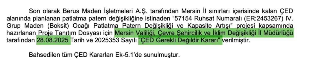 Madenin ÇED süreciyle ilgili de kafa karışıklığı var. Genişletme girişimi basına ilk yansıdığında, Mersin Çevre, Şehircilik ve İklim Değişikliği Müdürlüğü’nün “ÇED gerekli değildir” kararı verdiği yazıldı. Oysa Çevre, Şehircilik ve İklim Değişikliği Bakanlığı’nın ÇED duyurularını listelediği web adresinde arama yapılınca 3 Kasım 2025 tarihli “ÇED süreci başlatılmıştır” ifadesi görülüyor. Yani aslında süreç yeni başlıyor.