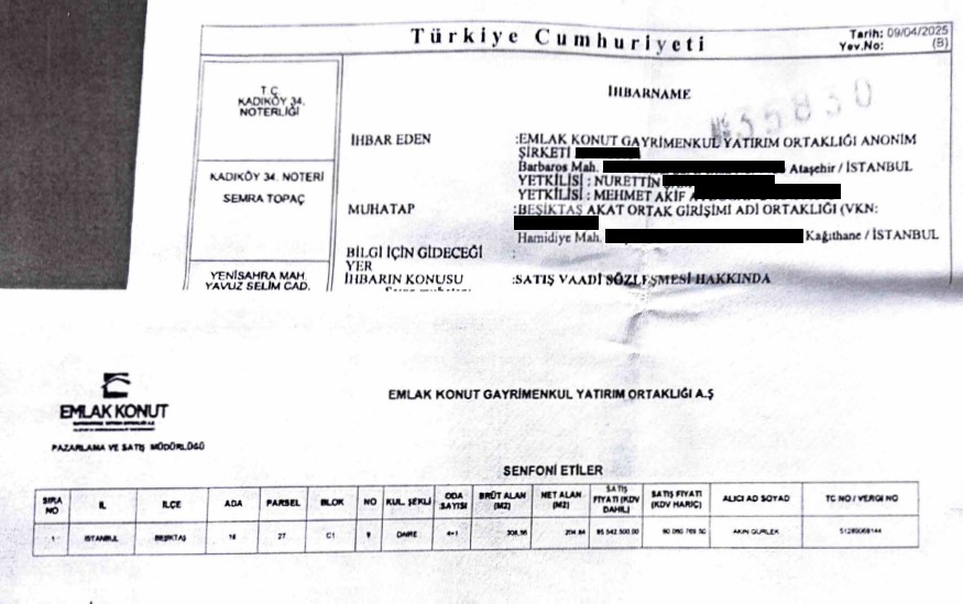 Gürlek’in Emlak Konut Gayrimenkul Yatırım Ortaklığı A.Ş.’den İstanbul Beşiktaş’ta bulunan bir daireyi satın almak amacıyla satıcıyla satış vaadi sözleşmesi yapmak için 16 Haziran 2025’te ön protokol yaptığı savunuldu.