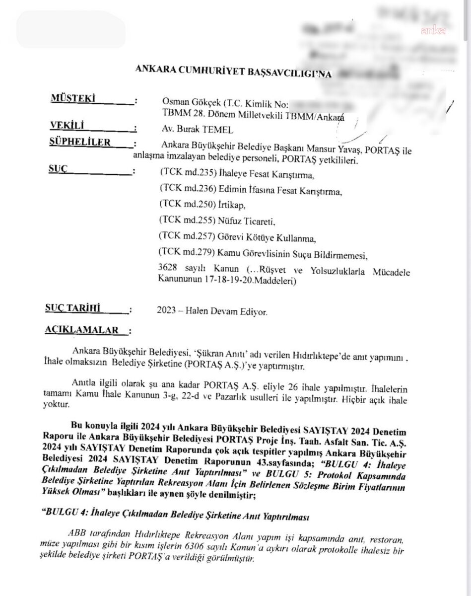Osman Gökçek tarafından Cumhuriyet Başsavcılığı’na sunulan dilekçede, Hıdırlıktepe’de yürütülen rekreasyon alanı ve anıt projelerine ilişkin, “ihaleye fesat karıştırma” ve “görevi kötüye kullanma” iddiaları yer aldı.
