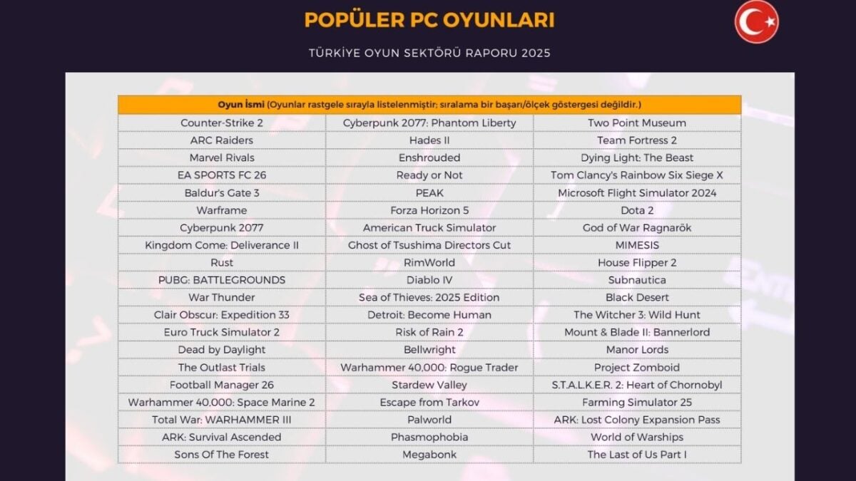 Aynı rapordaTürkiye’de en popüler PC oyunları da listelendi. En popüler yüzlerce oyunu sıralayan listede Counter-Strike 2 gibi geçmişi maziye dayanan oyunlar da yer alıyor yeni çıkan ARC Raiders gibi oyunlar da. Listede, Marvel Rivals, Hades II, PEAK, Forza Horizon 5, Diablo IV, Palworld, Megabonk, The Outlast Trials ve Cyberpunk 2077 gibi popüler oyunlar yer alıyor.