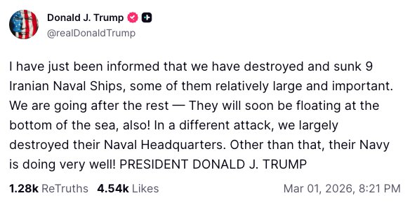 “Az önce, dokuz İran donanma gemisini imha edip batırdığımızı öğrendim. Bunların bazıları nispeten büyük ve önemli gemilerdi. Geri kalanlarını da takip ediyoruz. Onlar da yakında denizin dibinde yüzecekler! Başka bir saldırıda, donanma karargahlarını büyük ölçüde imha ettik. Bunun dışında, donanmaları çok iyi durumda!”