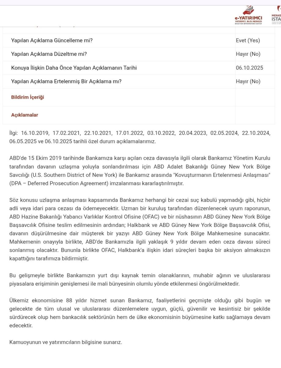 Kamuyu Aydınlatma Platformu (KAP), ABD Adalet Bakanlığı Güney New York Bölge Savcılığı ile Halkbank arasında “Kovuşturmanın Ertelenmesi Anlaşması” imzalandığını duyurdu. Açıklamada, “Söz konusu uzlaşma anlaşması kapsamında Bankamız herhangi bir cezai suç kabulü yapmadığı gibi, hiçbir adli veya idari para cezası da ödemeyecektir” denildi.