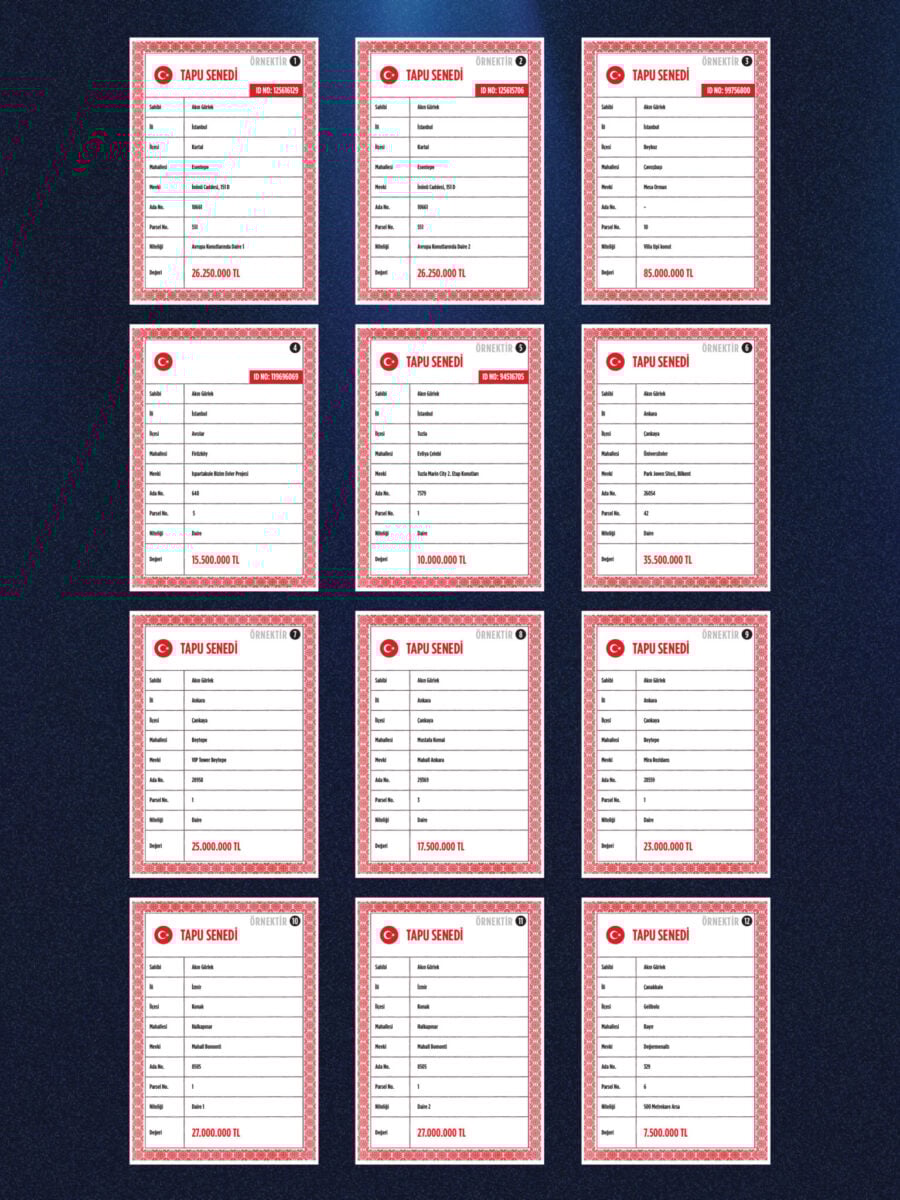 Özel, tapu fotoğraflarını göstererek Gürlek’in toplam değeri 325,5 milyon TL eden şu mülklere sahip olduğunu söyledi: