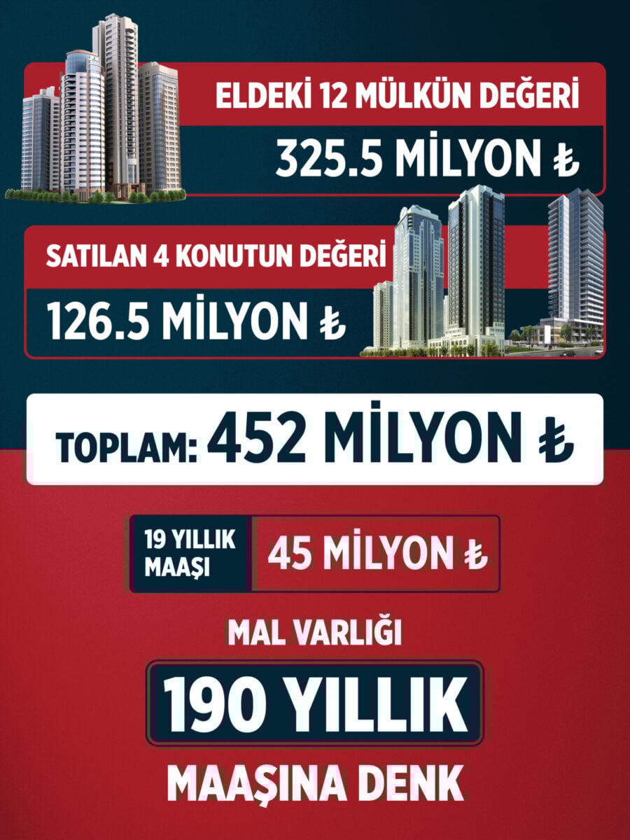 “Hesapta bir kuruş kenarda para yoksa toplam gayrimenkuller ve satılan gayrimenkullerin değeri 452 milyon TL. 19 yıl boyunca bütün maaşlarını İstanbul Cumhuriyet Başsavcısı olarak alınan Türkiye’deki en yüksek maaştan alsa biriktirse bir ekmek almasa bir ekmek almasa, 1 kWh saat elektrik parası ödemese bir şişe suyu alıp içmese toplam maaşları 45 milyon TL, toplam gelir 452 milyon TL. 19 aylık yıllık maaşıyla 190 yılda alamayacağı kadar gayrimenkul almış.”