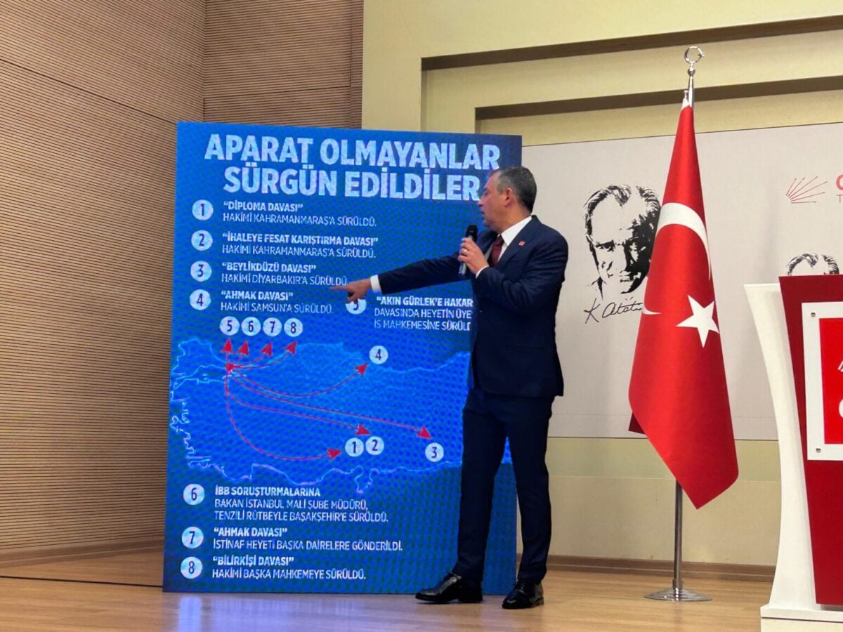 Özel, İstanbul Büyükşehir Belediye (İBB) Başkanı Ekrem İmamoğlu’nun davalarına bakan ve beraat kararı veren, avukatı Mehmet Pehlivan’ı duruşmaya bağlayan veya ceza kararına şerh koyan hakimlerin sürgün edildiğini anlattı.