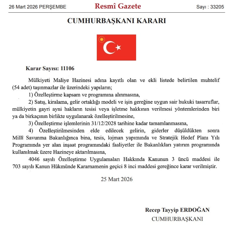 AKP Genel Başkanı ve Cumhurbaşkanı Recep Tayyip Erdoğan’ın imzasıyla Resmî Gazete’de yayımlanan kararla, 14 ildeki 54 taşınmaz ile üzerlerindeki yapılar özelleştirme kapsam ve programına alındı. Kararda, söz konusu taşınmazların satış, kiralama, gelir ortaklığı modeli ya da mülkiyetin gayriaynî haklarının tesisi gibi yöntemlerle özelleştirilebileceği belirtildi.