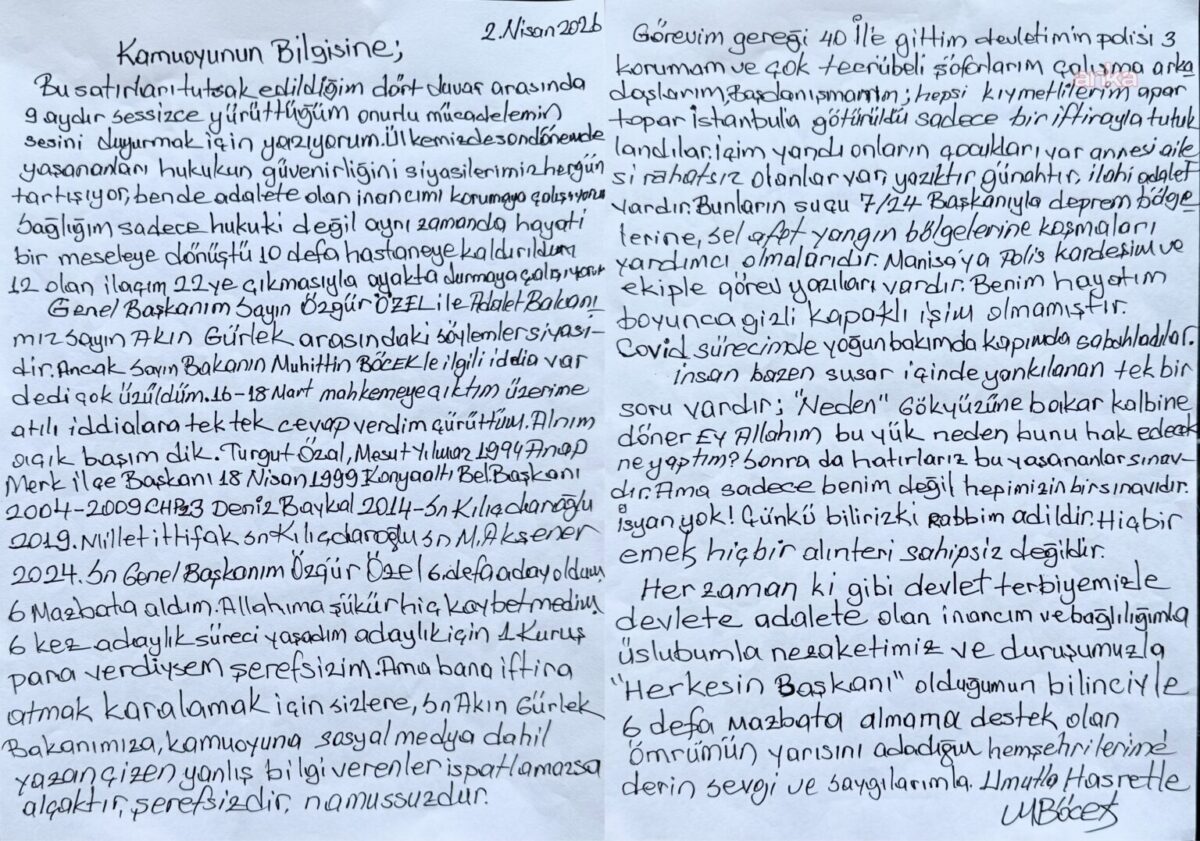 6 kez adaylık süreci yaşadım, adaylık için 1 kuruş para verdiysem şerefsizim. Ama bana iftira atmak karalamak için sizlere, Sayın Akın Gürlek Bakanımıza, kamuoyuna sosyal medya dahil yazan çizen, yanlış bilgi verenler ispatlamazsa alçaktır, şerefsizdir, namussuzdur. Görevim gereği 40 ile gittim. Devletimin polisi, 3 korumam ve çok tecrübeli şoförlerim, çalışma arkadaşlarım, başdanışmanım; hepsi kıymetlilerim. Apar topar İstanbul’a götürüldü, sadece bir iftirayla tutuklandılar. İçim yandı, onların çocukları var, annesi, ailesi rahatsız olanları var. Yazıktır, günahtır, ilahi adalet vardır. Bunların suçu 7/24 Başkanıyla deprem bölgelerine, sel afet yangın bölgelerine koşmaları yardımcı olmalarıdır. Manisa’ya polis kardeşim ve ekiple görev yazıları vardır. Benim hayatım boyunca gizli kapaklı işim olmamıştır. Covid sürecimde yoğun bakımda kapımda sabahladılar.