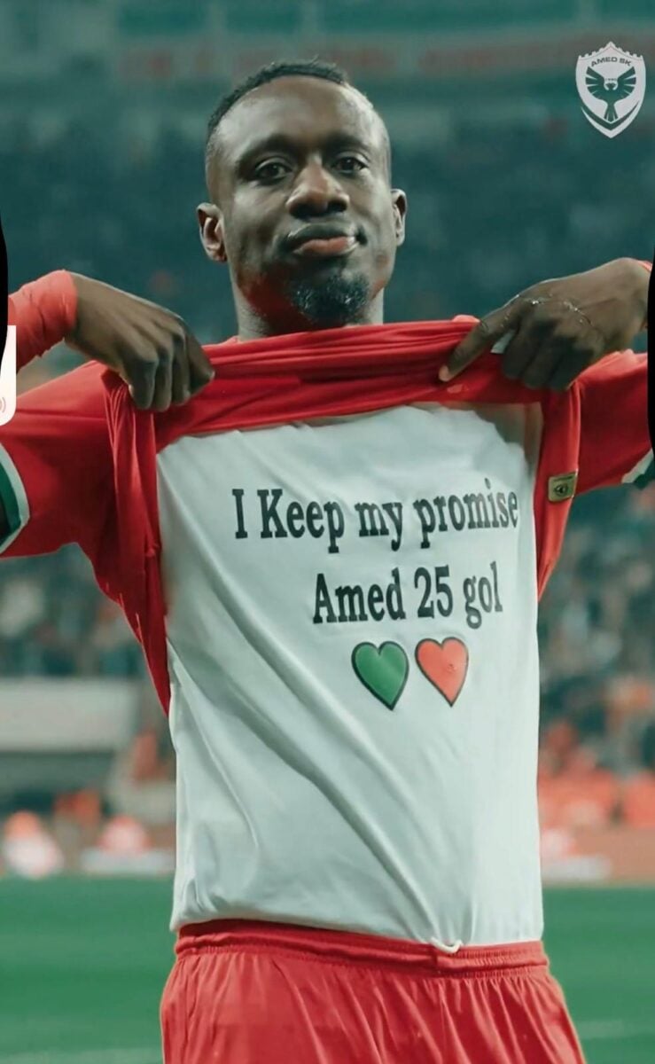 Diagne, Boluspor’a attığı ve kendisinin 25. golü olan sayıdan sonra yedek kulübesine gelerek, formasının altındaki tişörtte yazılı olan “25 gol sözünü yerine getirdiğine” dair mesajı gösterdi.