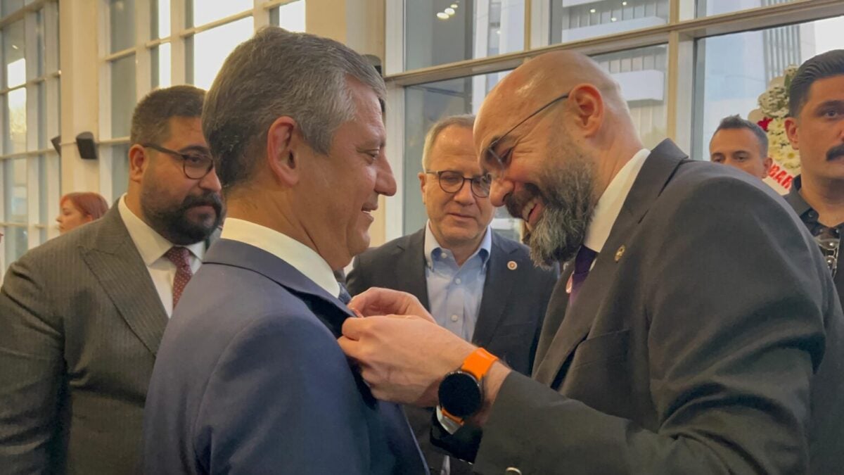 Özel, salona girerken ÇGD Başkanı Kıvanç El tarafından yakasına, “Gazetecilik suç değildir” yazılı rozet takıldı.