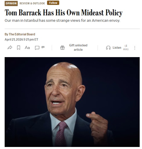 Dünyanın en etkili medya kuruluşlarından Wall Street Journal (WSJ), ABD’nin Ankara Büyükelçisi Tom Barrack’ı sert sözlerle hedef alan bir başyazı yayımladı. Gazetenin yayın kurulu, Barrack’ın ABD’nin Ortadoğu politikasını savunmak yerine Türkiye, Hizbullah ve İran konusunda Washington’ın çizgisiyle çelişen açıklamalar yaptığını yazdı. Tom Barrack için “İstanbul’daki adamımız” diyen WSJ’nin bu yazısını sizler için Türkçeleştirdik.