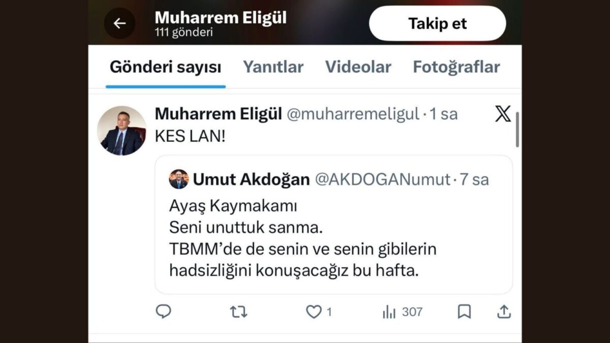 Eligül, CHP Ankara Milletvekili Umut Akdoğan’ın “Ayaş Kaymakamı seni unuttuk sanma. TBMM’de de senin ve senin gibilerin hadsizliğini konuşacağız bu hafta” paylaşımına verdiği “Kes lan” yanıtıyla tepki çekmişti.