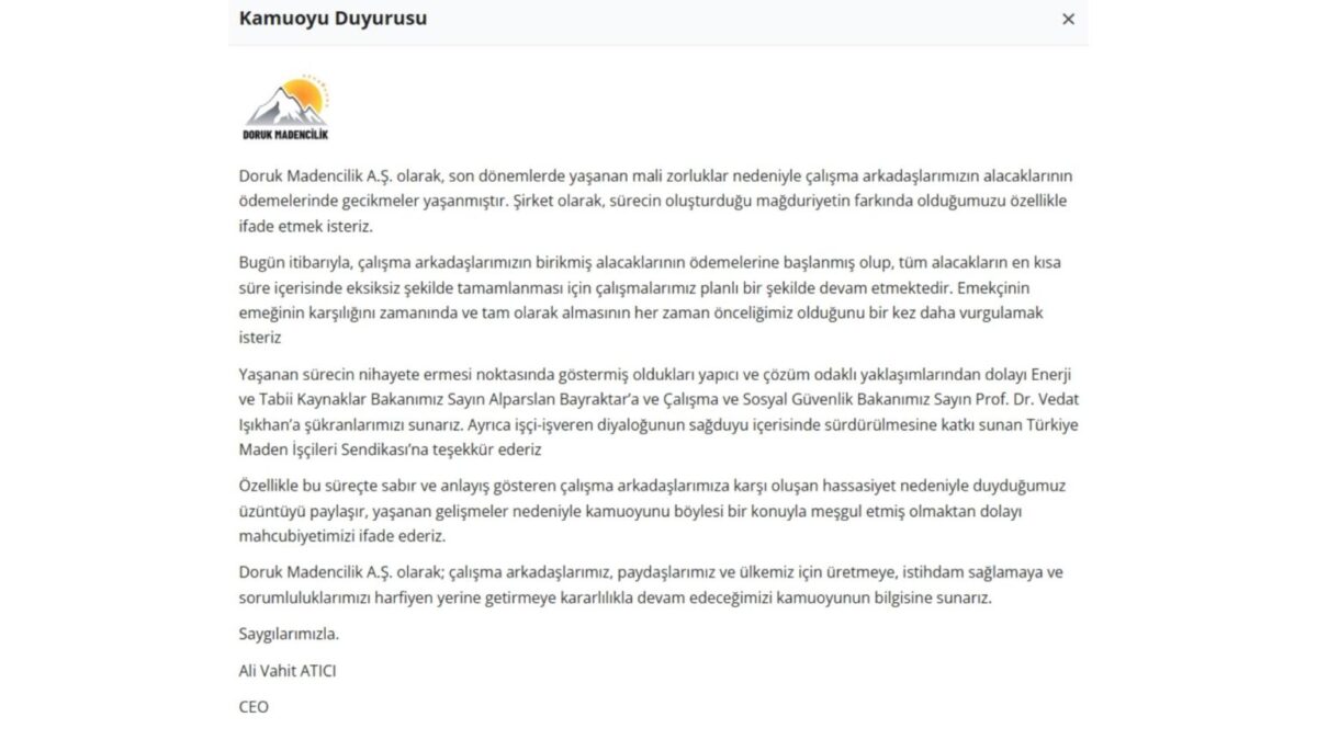 ‘’Doruk Madencilik A.Ş. olarak, son dönemlerde yaşanan mali zorluklar nedeniyle çalışma arkadaşlarımızın alacaklarının ödemelerinde gecikmeler yaşanmıştır. Şirket olarak, sürecin oluşturduğu mağduriyetin farkında olduğumuzu özellikle ifade etmek isteriz.